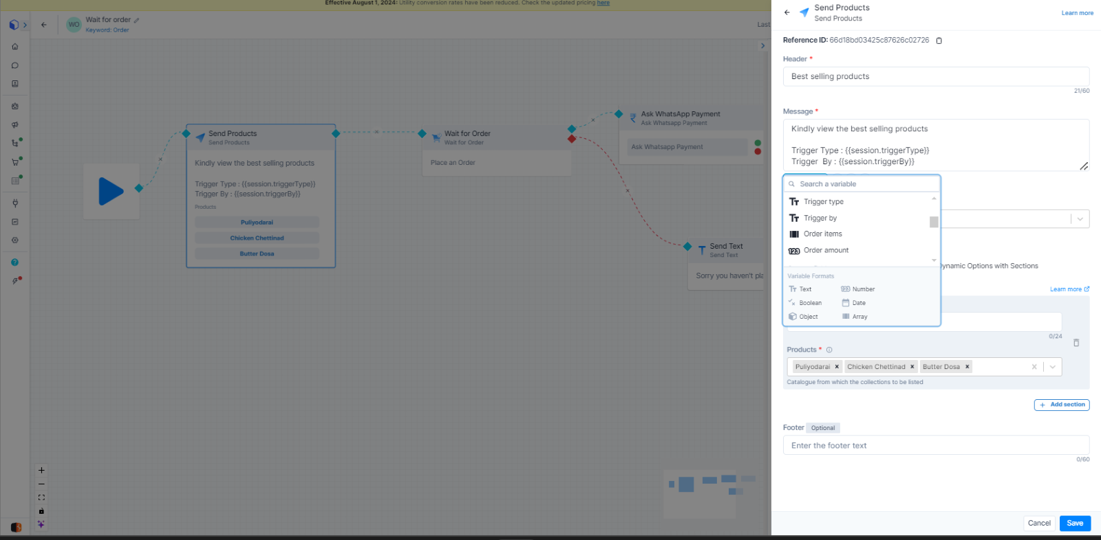A new node, 'Wait for Order,' has been added to the Bot, functioning like an Ask card. It requires a question text and, by default, enables Fall back. When executed, this card prompts the end user to place an order. It utilizes session variables for Order items and Order amount.